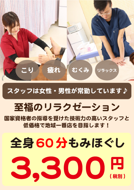 そこで、強い圧力で筋肉にもみほぐしを行い血液循環を良くする事により様々な体の悩みを改善します。